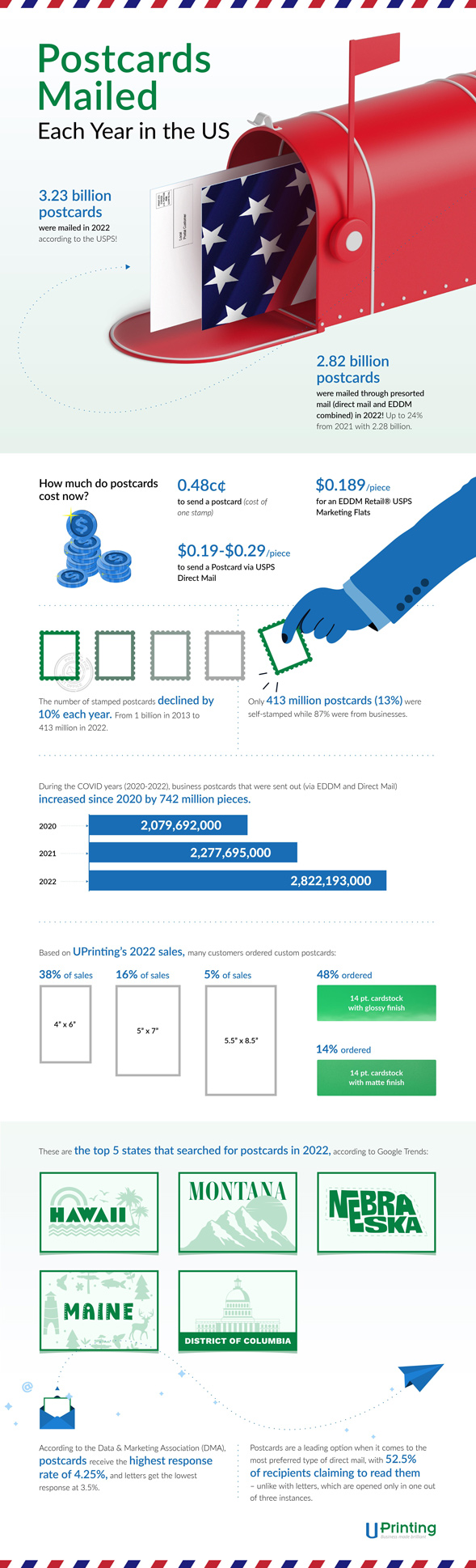 While we get a lot of things done online these days, people still send a ton of letters and postcards each year. This infographic from UPrinting covers how many postcards are mailed each year in the US: