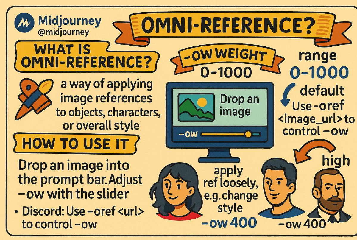 Midjourney has introduced a whole host of new features over the past few months. Omni-Reference may be the most powerful one yet. It lets you bring humans, animals, and objects into your shots and adjust their strength with –ow parameter from 0 to 1000. You will just have to use the –oref parameter in discord. On the web, it’s even much easier as you can just drag and drop images and change Omni strength. This infographic from Rad Neurons serves as a cheat sheet for it: