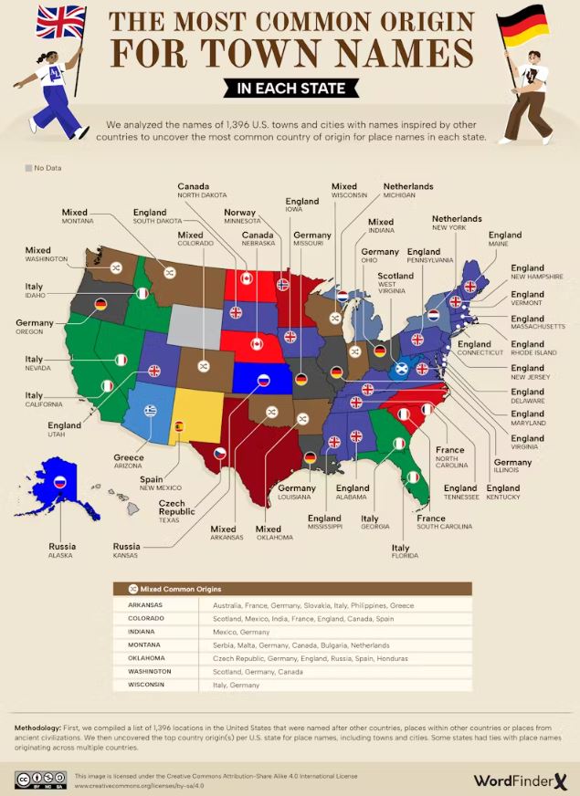 As you travel around the world, you are going to see cities with fancy names. Have you ever wondered what are the most common origin for town names in each state? This infographic from WordFinderx visualizes just that: