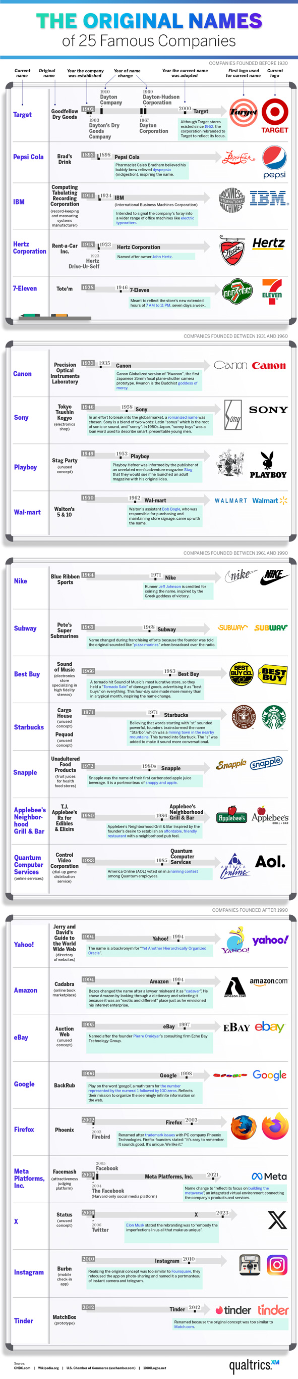 Large corporations go through rebranding and name changes all the time. Did you know that Target started as Goodfellow Dry Goods? How about Google starting out as BackRub decades ago? This infographic from Qualtrics covers the original names of 25 famous companies: