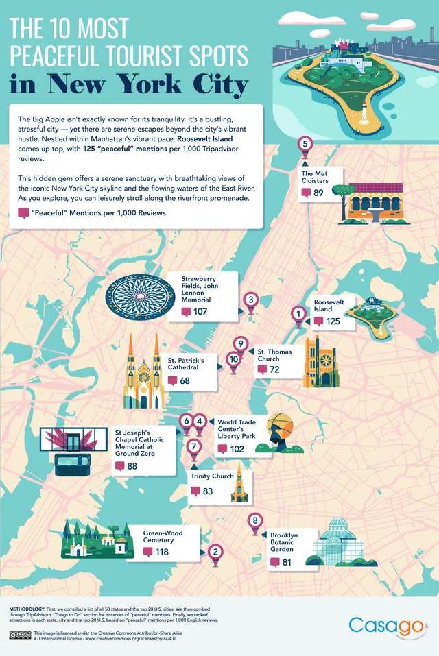 It is no secret that New York City is one of the most amazing cities for tourism. There are a ton of spots to visit but some are more peaceful than others as this infographic from Casago covers: