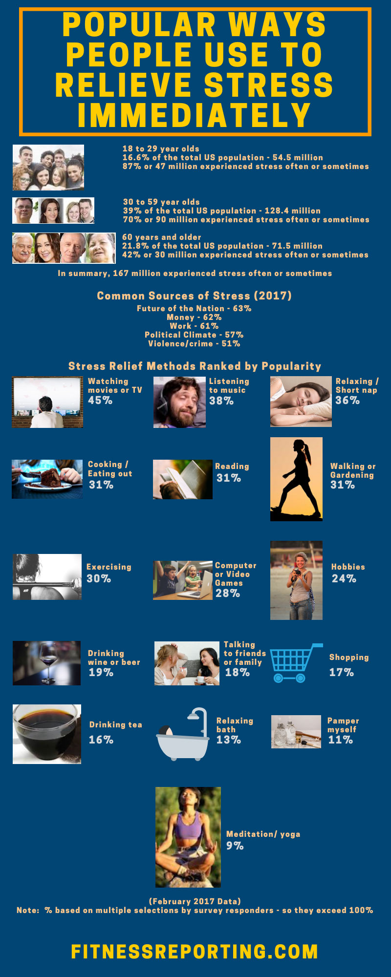 Dealing with stress is not fun but we all have to do it. Not everyone copes with it the same way, Listening to music, napping, walking, reading, exercising, and games are just a few ways people go about managing their stress as this infographic from Fitness Reporting shows:
