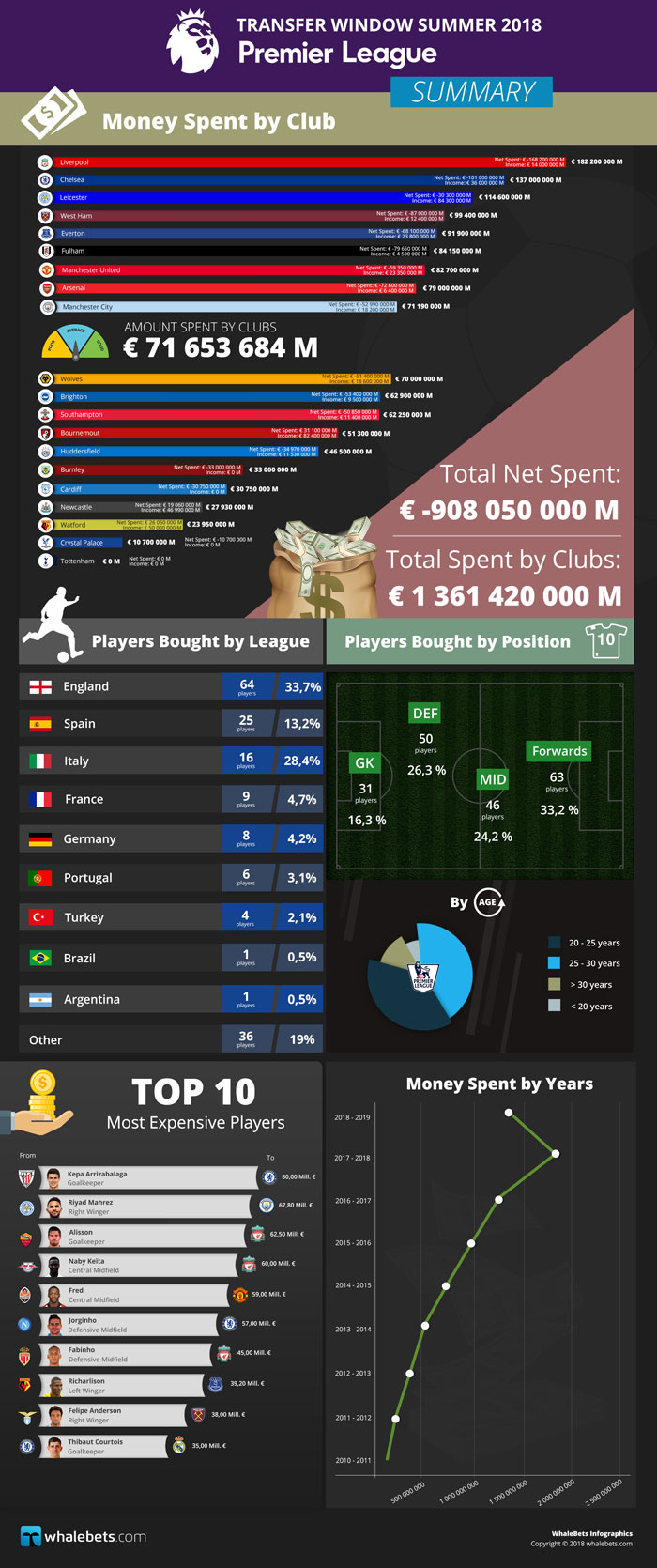 It is no secret that the English Premier League is the richest league in the world. Its clubs spend gigantic amounts on new players every season. This infographic from Whale Bets takes a look some interesting facts and stats from this league: