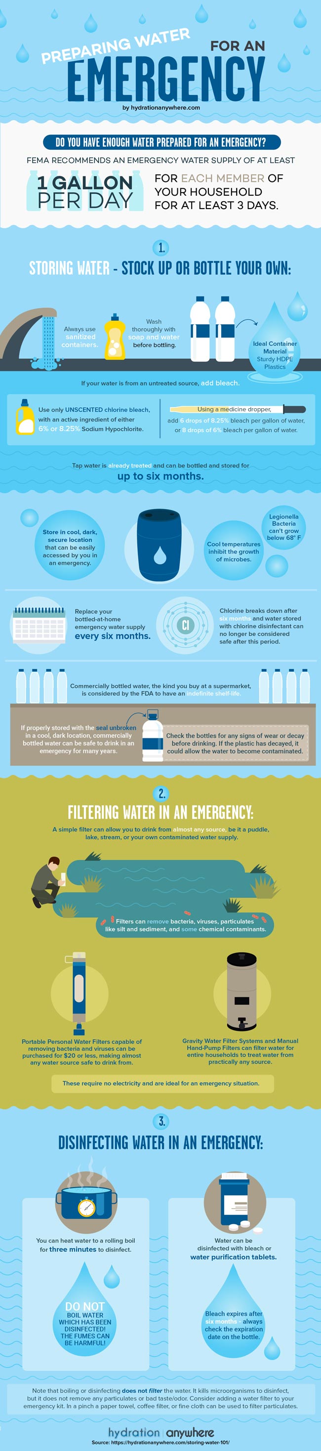 You never know when a natural disaster or emergency situation arises. Being prepared ahead of time is the best way to protect your family. This infographic from Hydration Anywhere covers how you can prepare water for an emergency:
