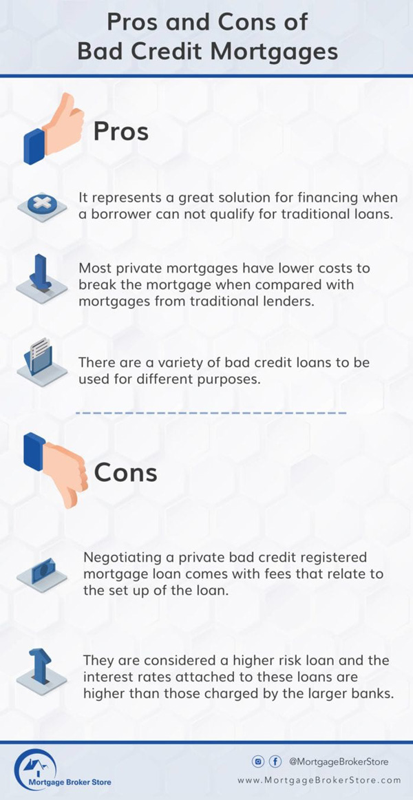 So what exactly is a Bad Credit Loan? Bad Credit mortgages are registered mortgage loans that are approved on criteria other than your Beacon Score or overall creditworthiness. Generally, these mortgages are shorter-length mortgages with higher interest rates, set up fees, and closing costs than standard mortgages. This infographic from Mortgage Broker Store takes a look at the pros and cons of bad credit mortgages: