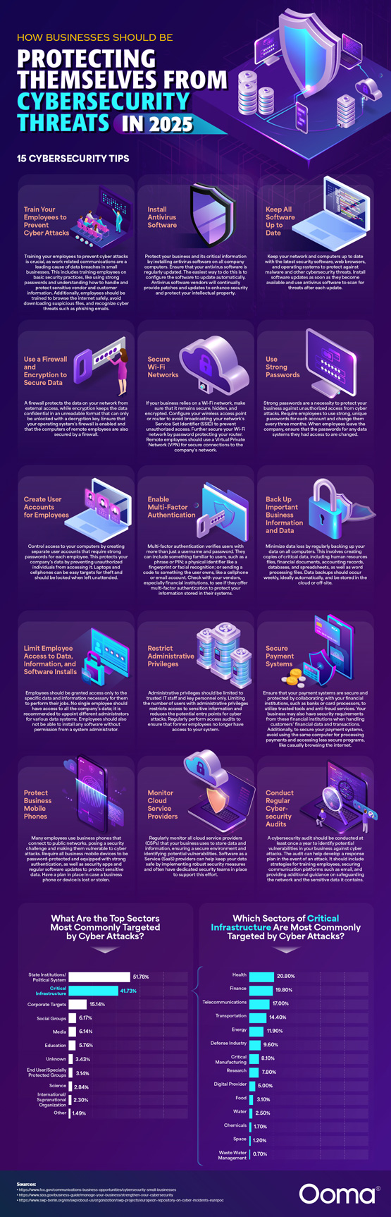 Running a business comes with headaches of its own. These days, business owners need to take measures to protect themselves against cyber security threats. This infographic form Ooma takes a look at how businesses can protect themselves against cybersecurity threats:
