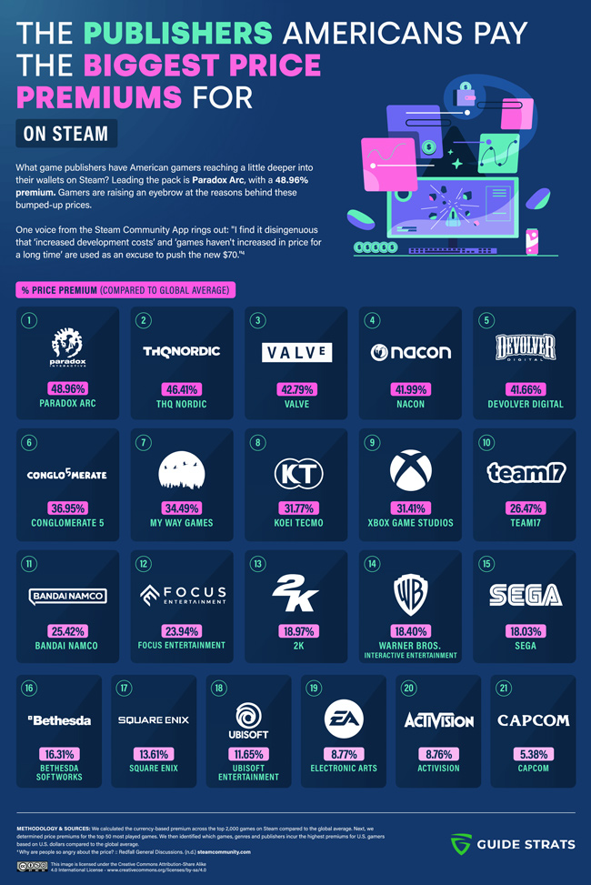 Steam shouldn’t need any introduction to gamers. You can find all kinds of publishers and titles to try on that platform, some of them more expensive than others. This infographic from Guide Strats shows the publishers Americans pay the biggest premiums for no Steam: