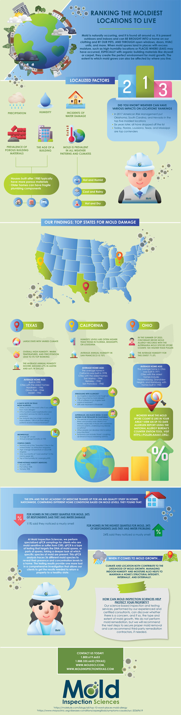 The Climate and location play a big factor when it comes to mold growth. By managing indoor moisture and humidity, you will be able to keep that in check. This infographic from Mold Inspection Sciences covers the moldiest locations to live: