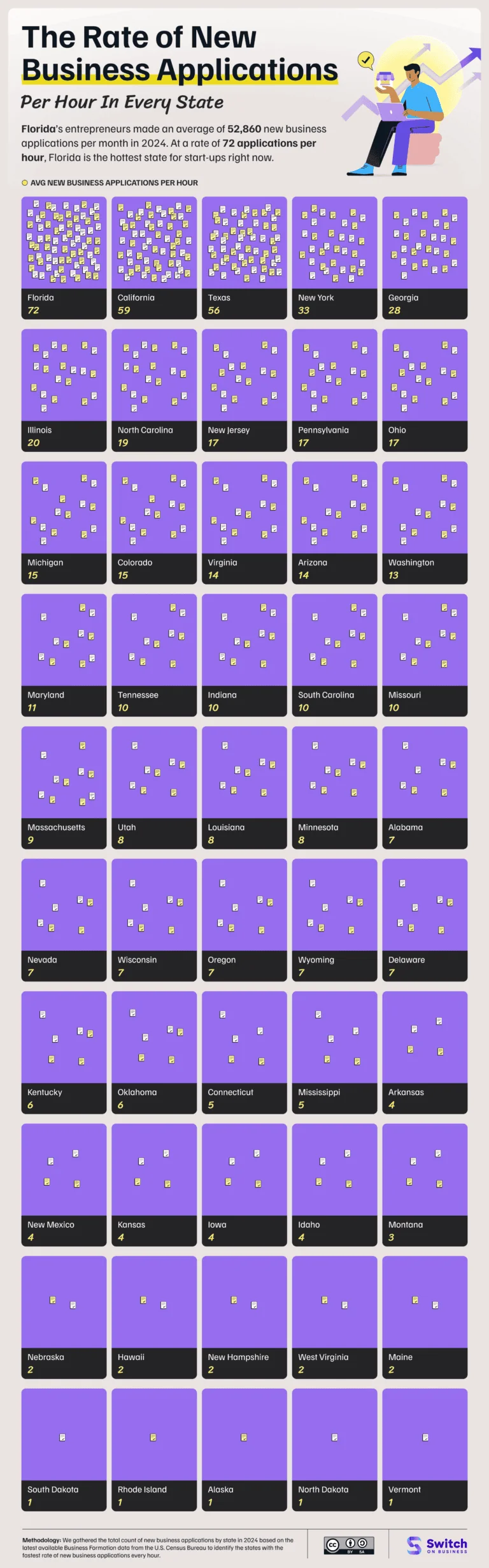 New businesses are started around the country every hour. Did you know that Florida’s entrepreneurs made over 52000 business applications per month last year? This infographic from Switch on Business takes a look: