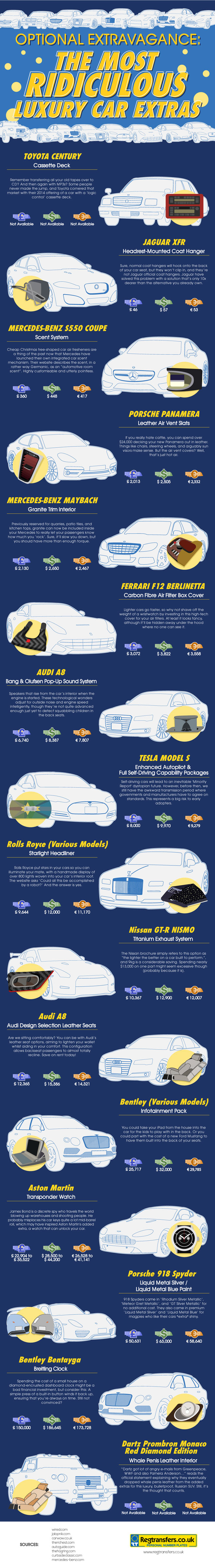 It is no secret that luxury cars come with a bunch of convenient features and expensive add-ons. This infographic from Regtransfers lists a few ridiculous luxury car extras you don’t want to miss: