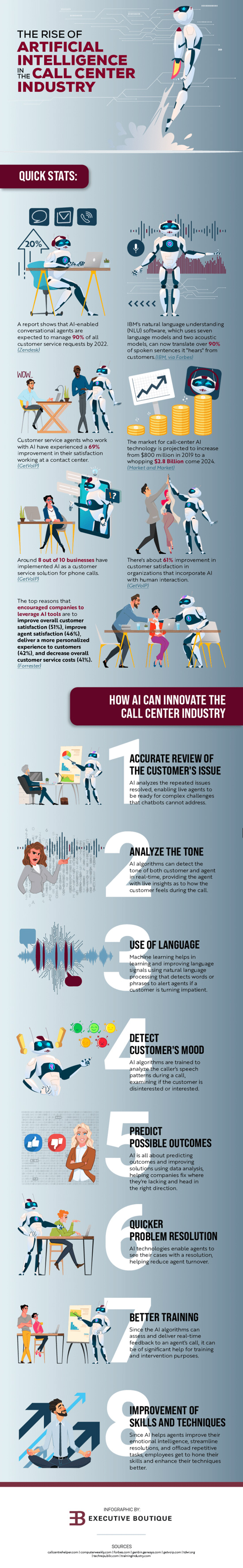 AI is going to transform many industries. Many businesses will use it to improve their customer service. This infographic from EB Call Center takes a look at how AI will change the call center industry: