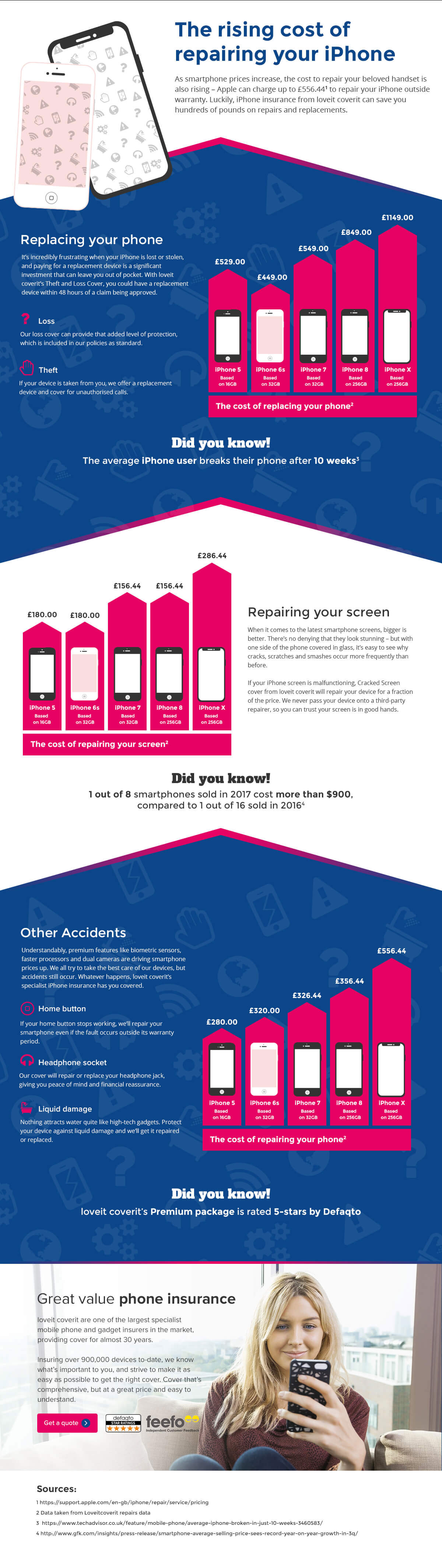 iPhones are becoming more sophisticated every year. They are not only becoming more expensive but also more costly to repair, especially without a warranty. This infographic from Loveit Coverit takes a look at how much it would cost to have repair done on your smartphone: