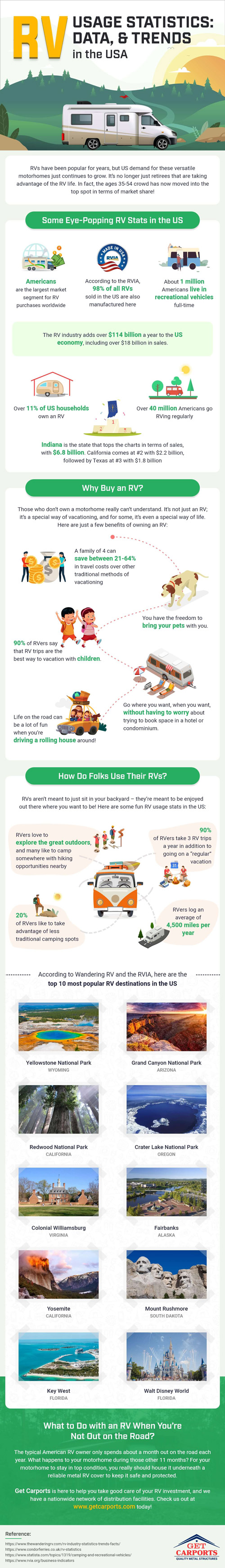 RVs have been popular for years. In fact, US demand for motorhomes is increasing all the time. This infographic from Get Carports has a few interesting stats on RV usage in the USA: