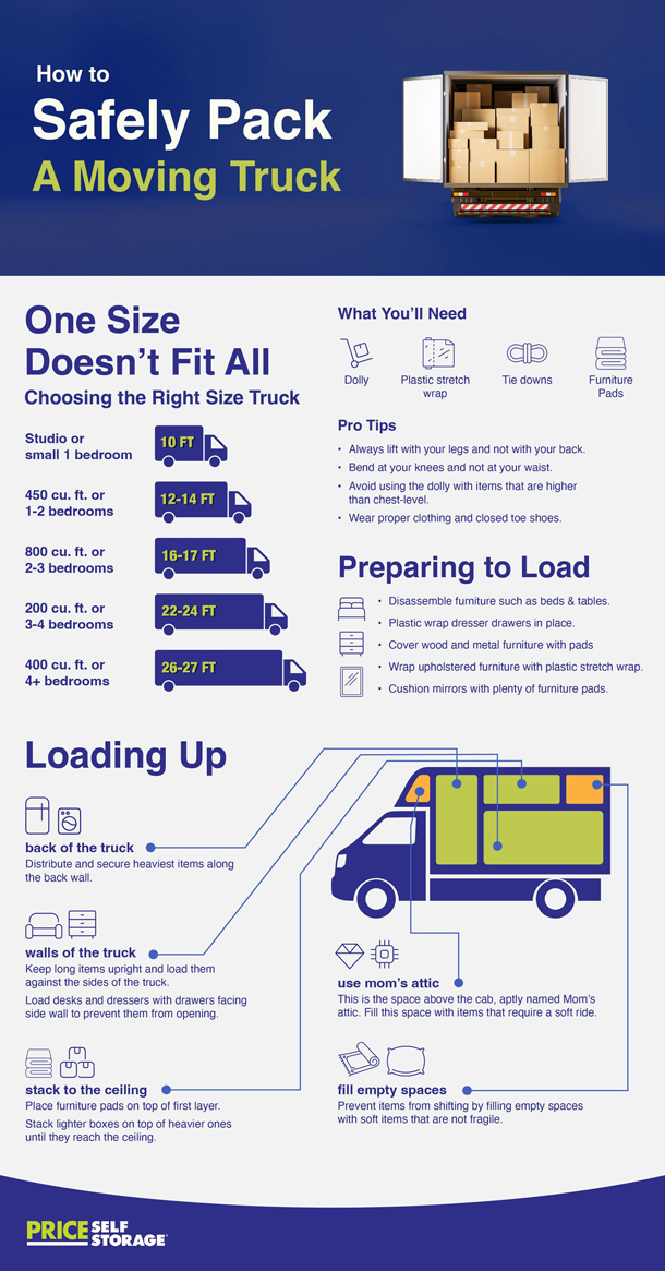 Moving to a new place is not everyone’s favorite activity. It can take a lot of time to move a bunch of stuff from one place to another. You will want to pick the right truck size and pack your things carefully. This infographic from Price Self Storage has a few tips on that: