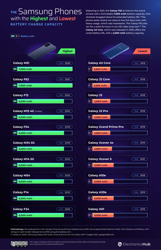 Investing in a high-end phone that has lousy battery life is not ideal. A lot of top models are getting better in this area. We have already covered the best Apple phones in this area. This infographic from Electronics Hubs covers the Samsung phones with the highest and lowest battery charge capacity: