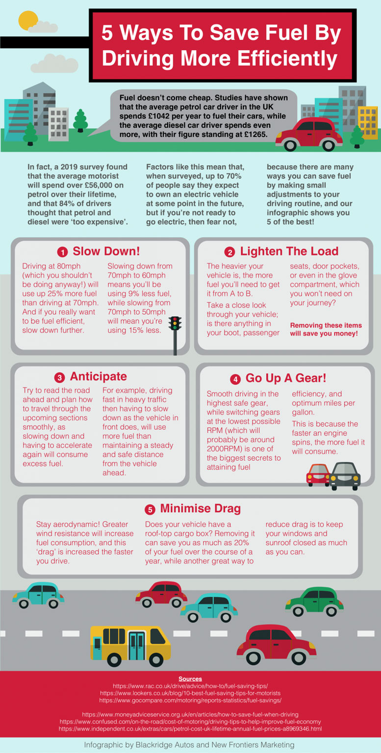 We all would love to save money on gas. Investing in the most fuel efficient car is not the only way to do that. By driving a bit slower than you usually do, staying alert on the road, lightening the load and staying aerodynamic, you get to consume less fuel while driving. This infographic from Blackridge Autos & New Frontiers Marketing has a few tips on this:
