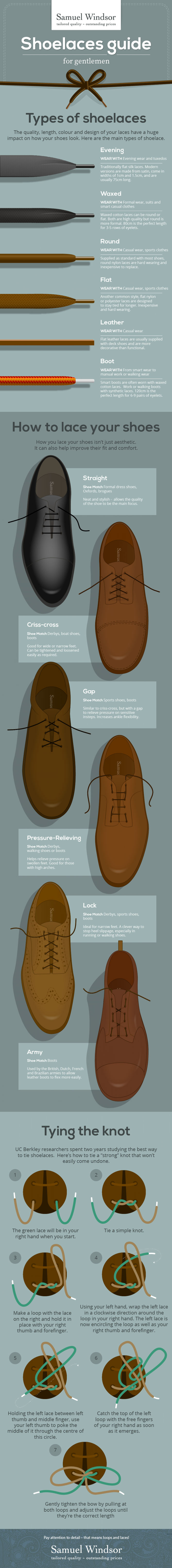 Most of us know how to lace our shoes. Not all shoelaces are the same, nor should you lace every shoe the same way. This infographic from Samuel Windsor serves as a guide for tying various shoelaces: