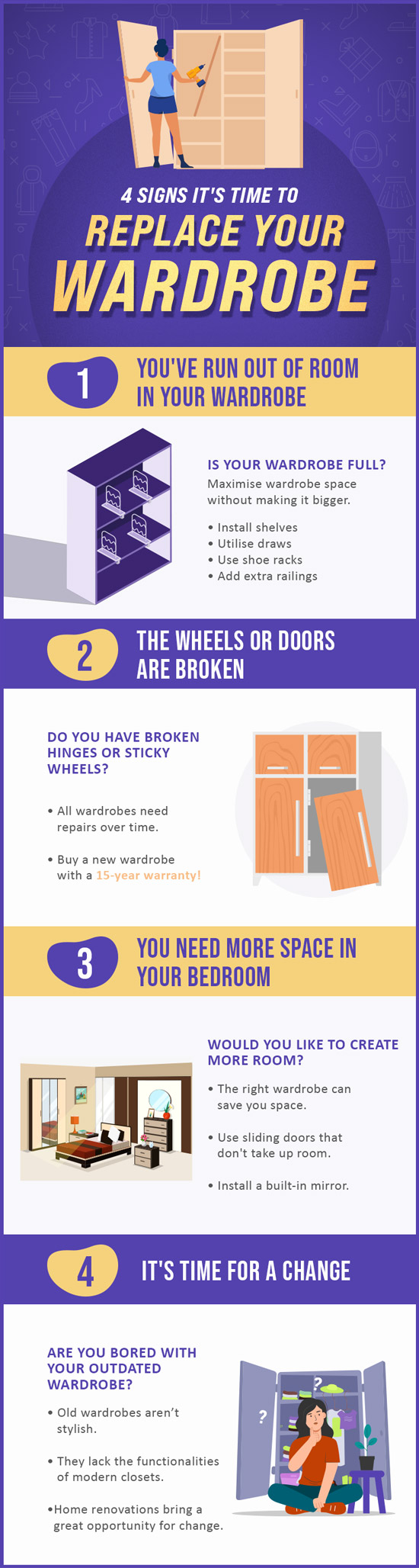 Have you ever run out of room in your closet? It can happen over time if you keep buying new clothes and keeping the old one. You can always keep your wardrobe organized by installing shelves and using shoe racks. At some point, you will have to replace it though. This infographic from Betta shows you when you need to upgrade your wardrobe:
