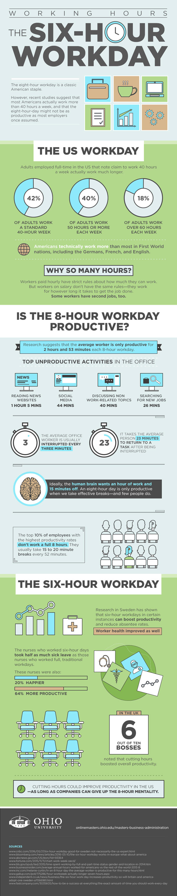 With robots taking over everything, we may not even have 8 hours worth of work to do everyday. Plenty of researchers believe that working 8 hours a day is not productive anyway. This infographic from Ohio University makes the case for shorter workdays: