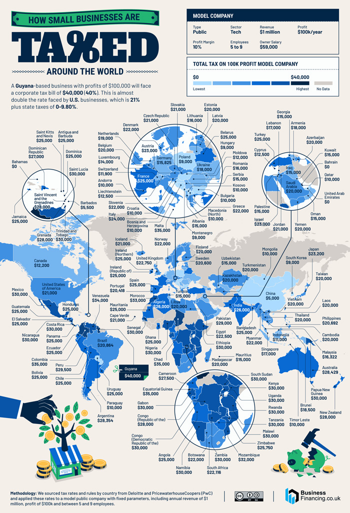 Starting a small business is exciting but not every country or city is business friendly with its taxes. Did you know that a Guyana based business with 100k profit will have to pay 40% tax, double the rate you face in the US? This infographic from Business Financing visaulizes how small businesses are taxed: