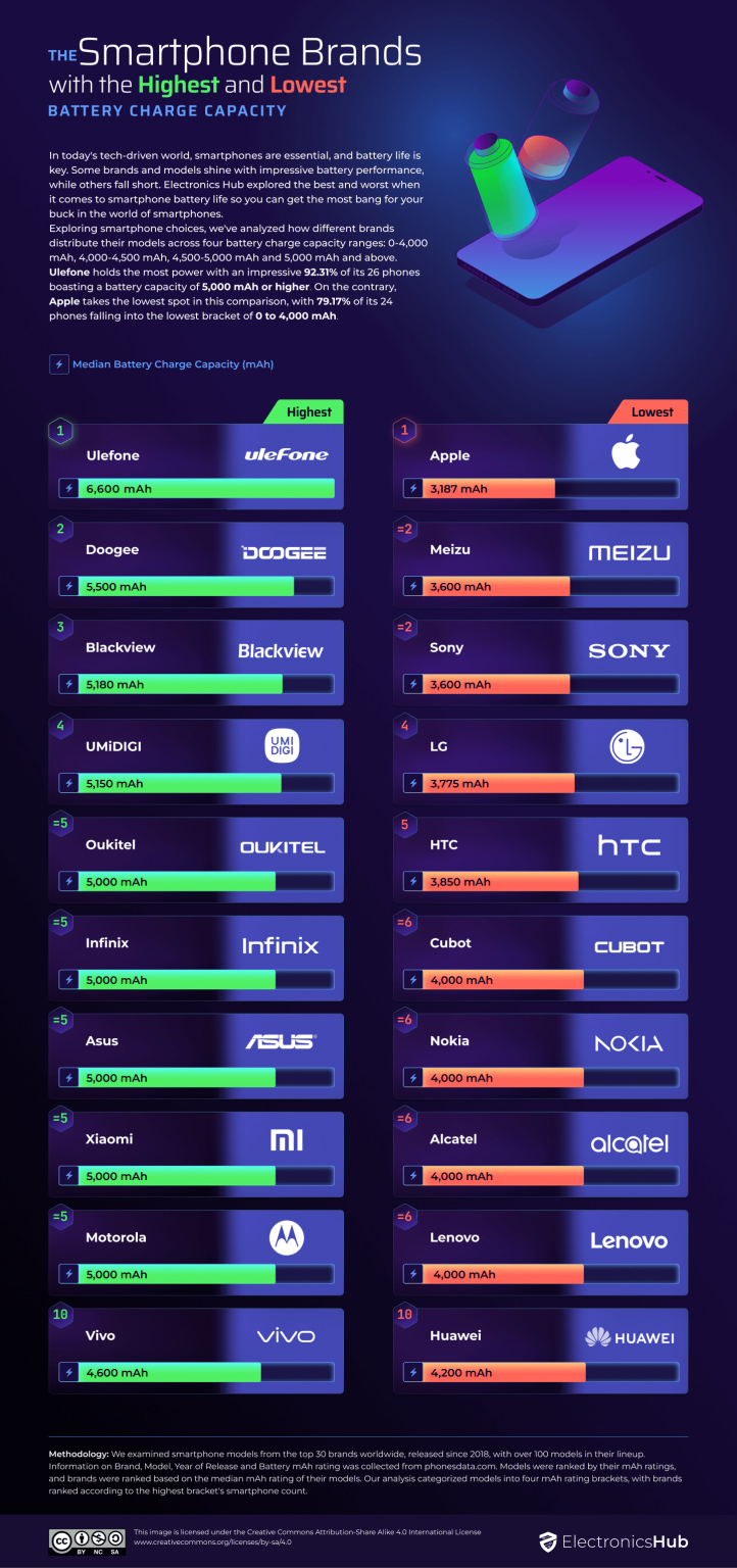 When it comes to smartphones, we all would love our devices to last longer on battery. Not every model ships with the same battery size. For instance, Apple iPhones don’t have the highest battery capacity. This infographic from ElectronicsHub takes a look at smartphone brands with highest and lowest battery capacity: