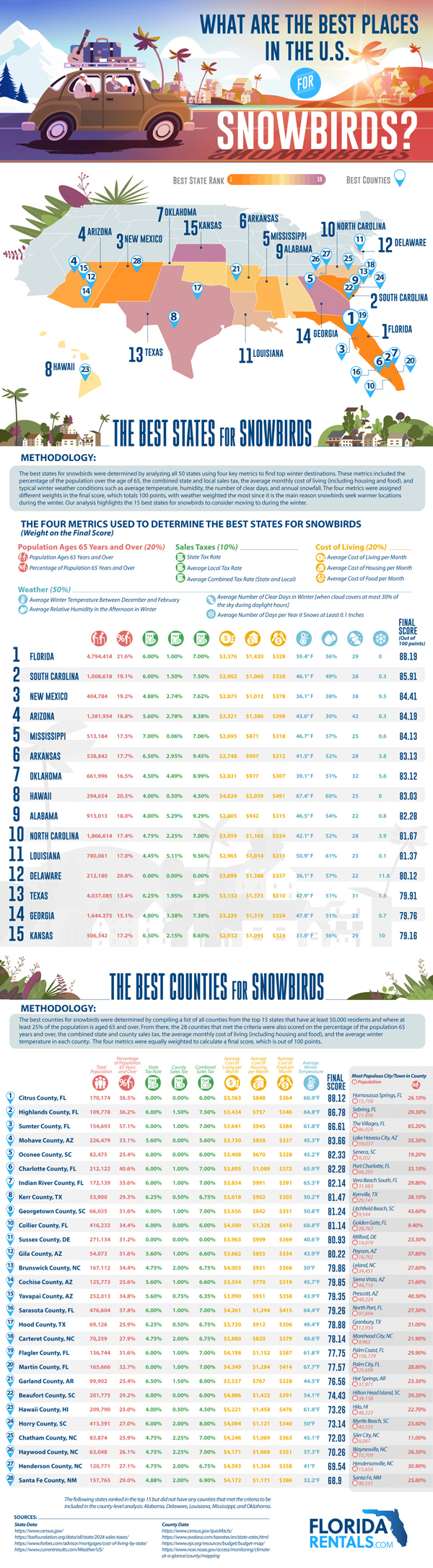 As people get older, they are more likely to move from a colder state in the North to the South. Before doing so, they will want to do their homework to pick the state with a reasonable cost of living and temperature. This infographic from Florida Rentals covers the best places in the US for snowbirds: