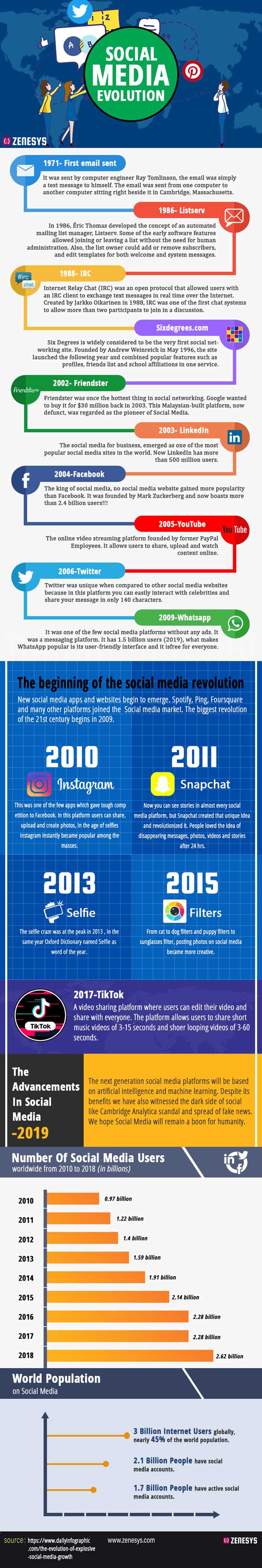Social networking has come a long way in the past few decades. The first e-mail was sent in 1971. Fast forward almost 50 years, and we have YouTube, WhatsApp and a whole host of new ways to communicate with others. This infographic from Zenesys takes a look at the evolution of social media over the years: