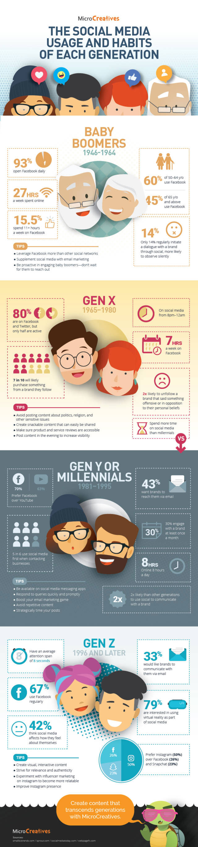 Social networking sites have millions of daily users. Not all of them belong to the same generation. This infographic from Micro Creatives takes a look at the social media usage and habits of baby boomers, Gen X, Millennials, and Gen Z: