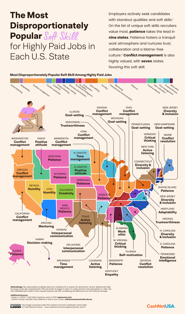 Having technical skills is necessary to stand out. Soft skills can be much harder to acquire and are required for various high paying jobs. This infographic from CashNetUSA covers popular soft skills for highly paid jobs in each state: