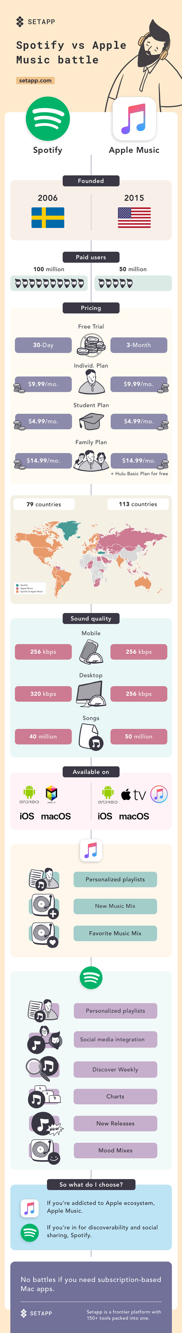 Music streaming services have come a long way over the years. You now have a bunch of affordable services to choose from to keep up with your favorite artists and discover new ones. This infographic from SetApp compares Spotify to Apple Music: