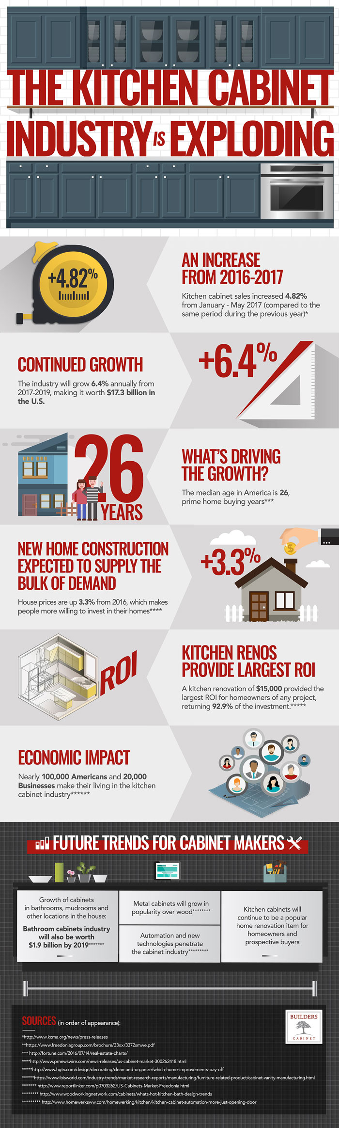 Most savvy homeowners know that performing kitchen and other common renovations can increase the value of their property. Did you know that the kitchen cabinet industry is growing, with sales increasing significantly from the previous year. This infographic from Builder’s Cabinet Supply takes a look at the state of the kitchen cabinet industry: