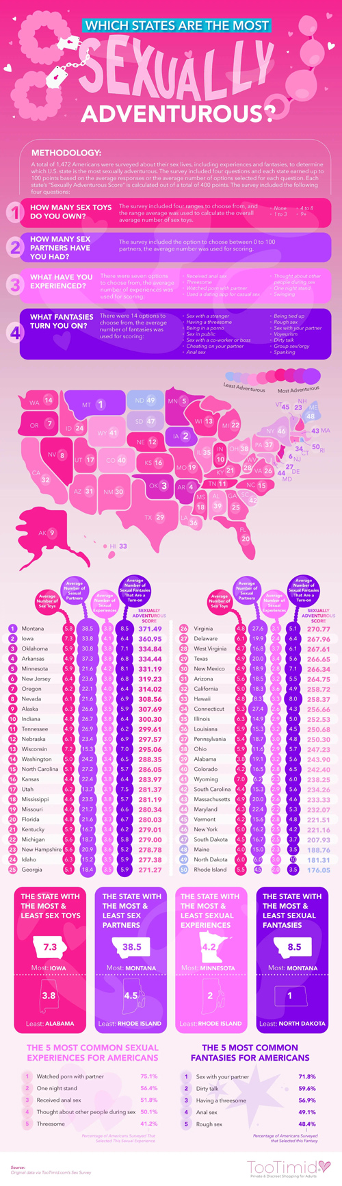 It is no secret that many Americans are very adventurous when it comes to their sex life. Getting them to share that information in polls is challenging though. This infographic from Too Timid has a few interesting stats on this: