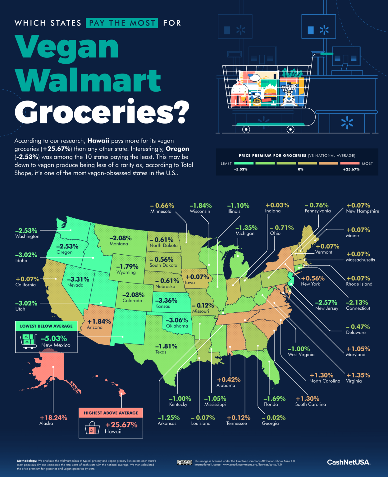 It is no secret that cost of living is not the same in every state. That applies to grocery items too. For instance, those who live in Hawaii pay the most for vegan groceries. This infographic from CashNetUSA visualizes states that pay the most for vegan Walmart groceries: