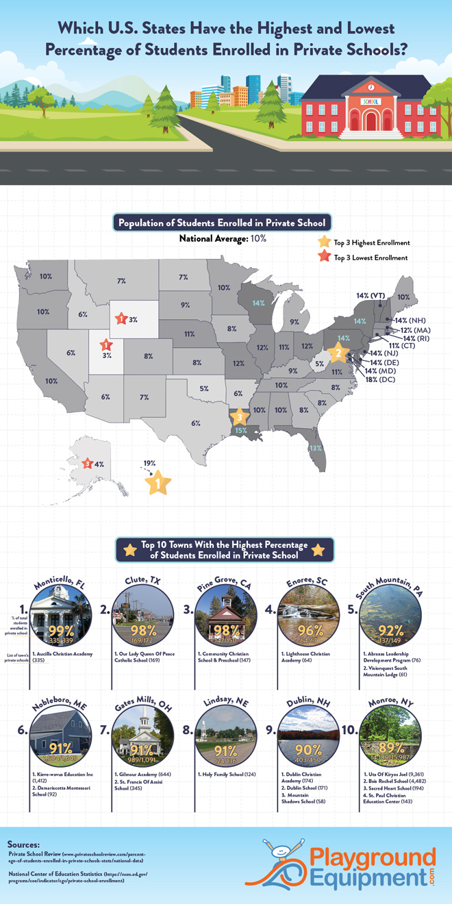 Many parents want to consider sending their kids to a private school but those can be quite costly. Did you know that on average, 10% of students are enrolled in a private school naturally? For example, here are the states for the lowest %s of private school enrollment: