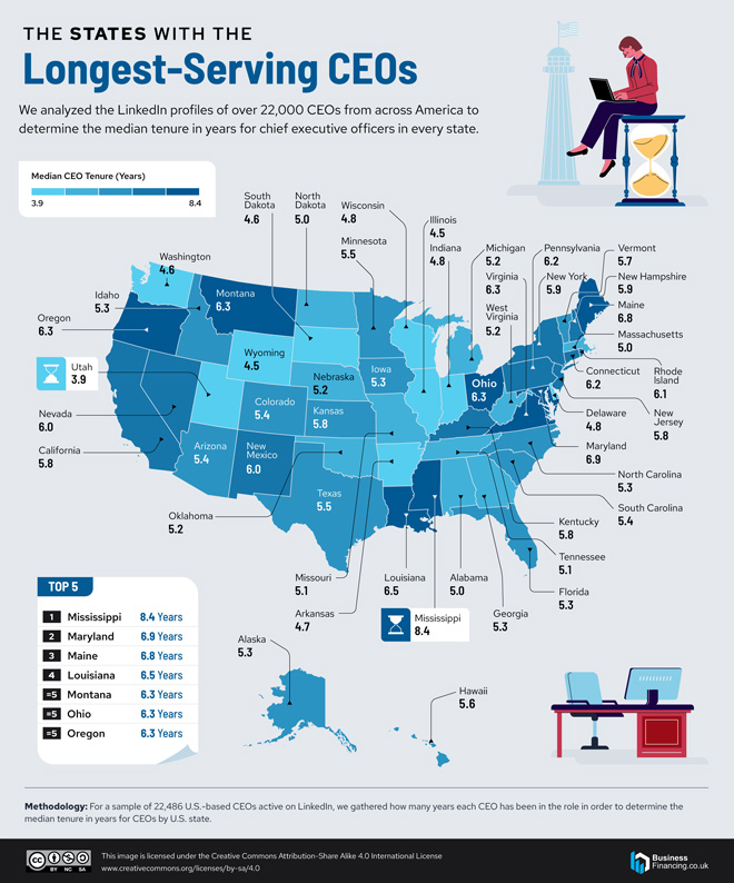 Many successful CEOs stick around for years at their company. It is tougher to hold on to these jobs in highly competitive industries. This infographic from Business Financing covers the states with the longest serving CEOs: