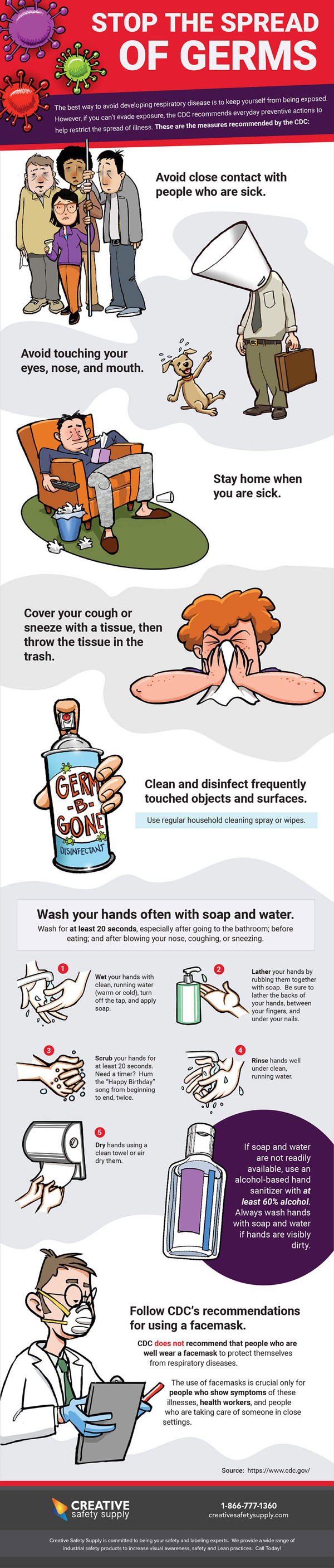 The coronavirus (COVID-19) has emerged in many countries around the globe. Some are taking drastic action to stop its spread. We all can take simple steps to avoid catching and infecting others. This infographic from Creative Safety Supply covers best practices established by the CDC for restricting the spread of respiratory illnesses: