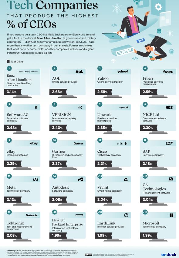 A lot of people in the corporate world dream of being a top CEO one day. You are more likely to get there if you work for certain companies, such as Microsoft, Meta, or eBay. This infographic from OnDeck covers top tech companies that produce the highest % of CEOs: