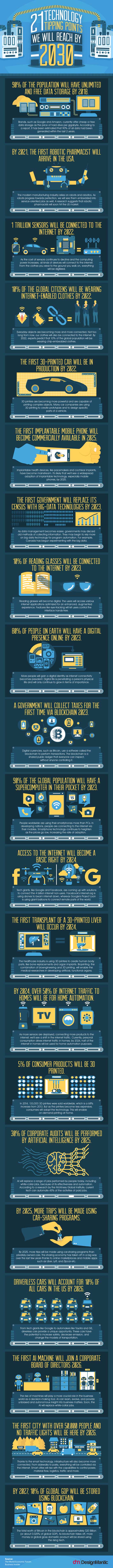 Everybody knows that robots will take many jobs from us in the very near future. Technology will change our lives in many other ways in a decade. By 2030, we could have robotic pharmacists, advanced self driving cars, implantable mobile phones, and 3D printed organ transplants. This infographic from DesignMantic takes a look at a few tipping points we will reach by 2030: