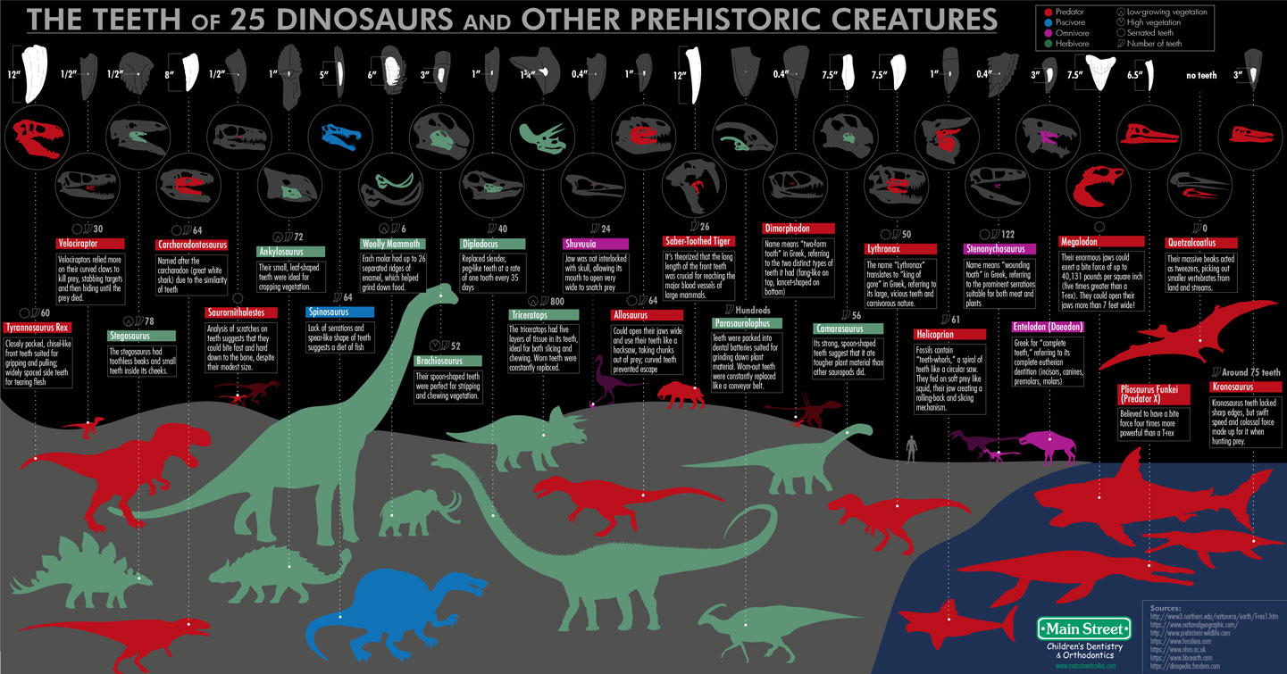 Dinosaurs and other prehistoric creatures are fascinating to study. They were not only large but also had scary teeth. This infographic from Main Street Children’s Dentistry & Orthodontics takes a look at teeth of dinosaurs and prehistoric creatures: