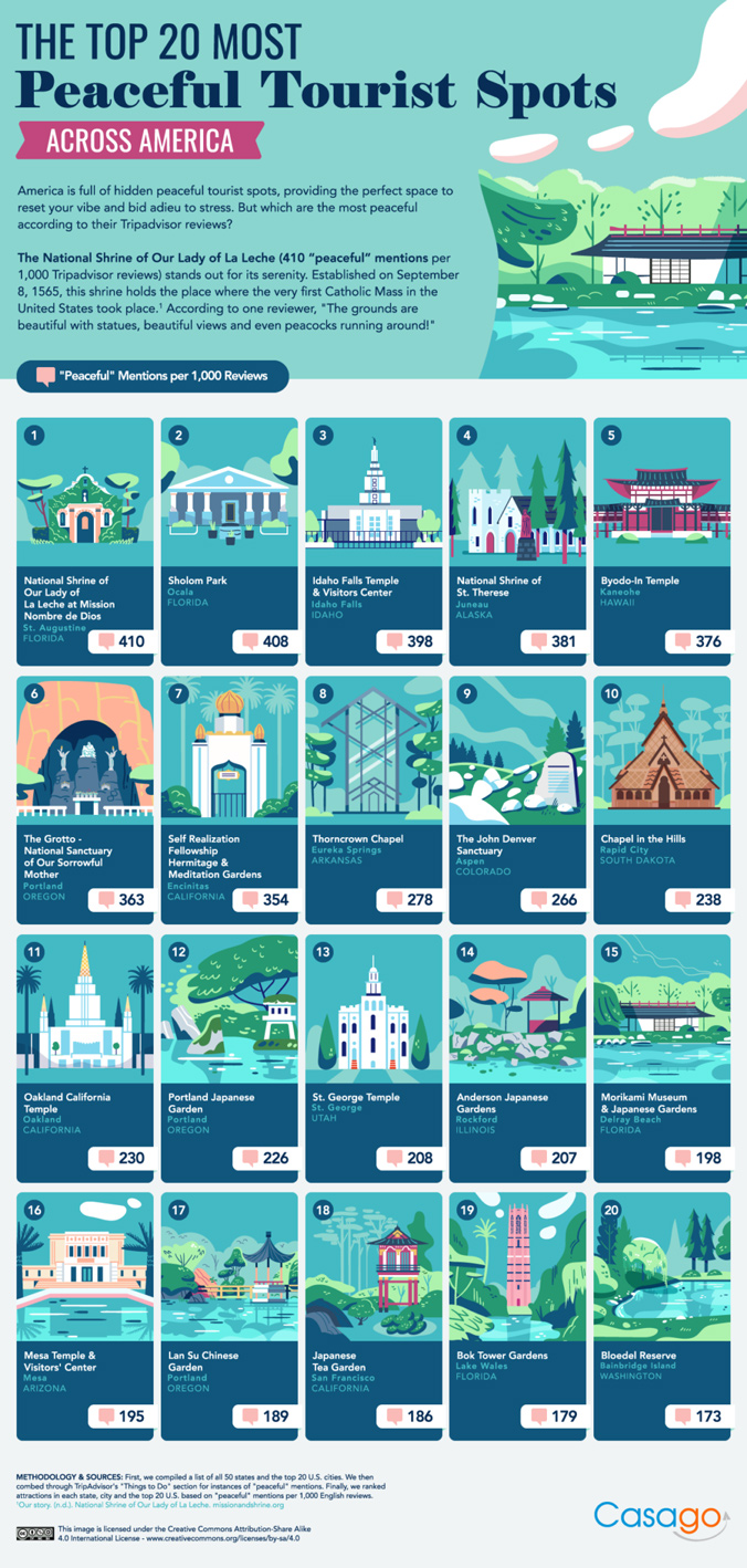 Traveling around the US can be a lot of fun. If you are planning to get a peaceful experience, you need to do your homework to pick the right spot. This infographic from Casago covers the top 20 most peaceful tourist spots in America: