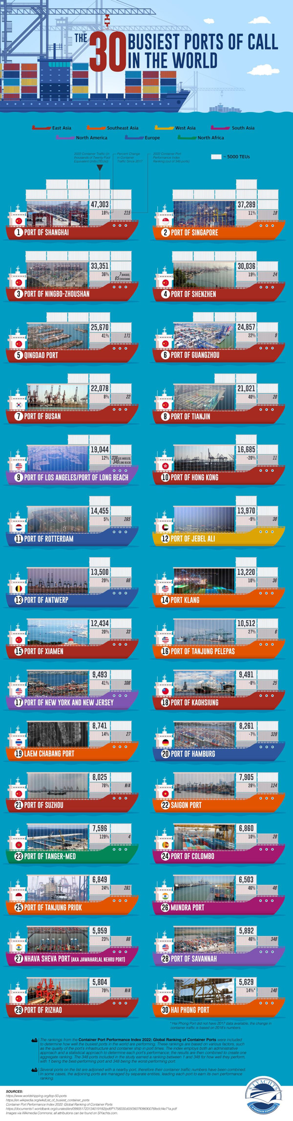 It is no secret that we need ships to transport goods all around the world. They all have to make stops at various ports. This infographic from Staten Island Yachts covers the 30 busiest ports of call in the world: