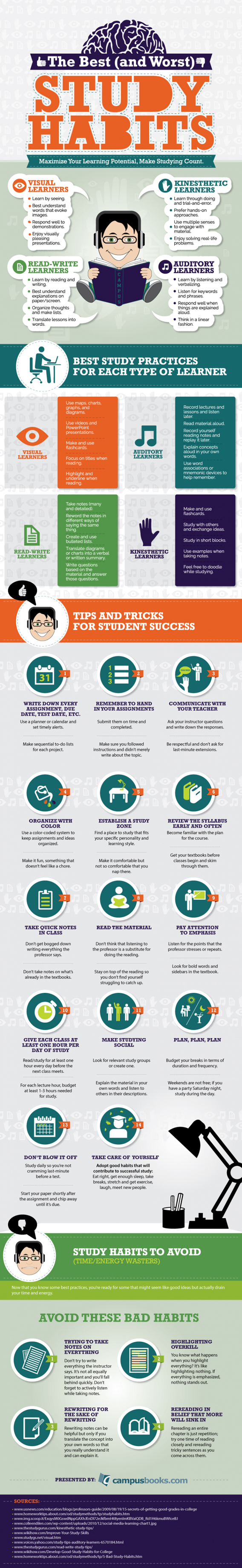 It is no secret that not all of us learn the same way as some of us are visual learners while some can learn by listening and verbalizing. There are various learning ways you can try to master complex topics. This infographic from Campus Books covers the best and worst study habits: