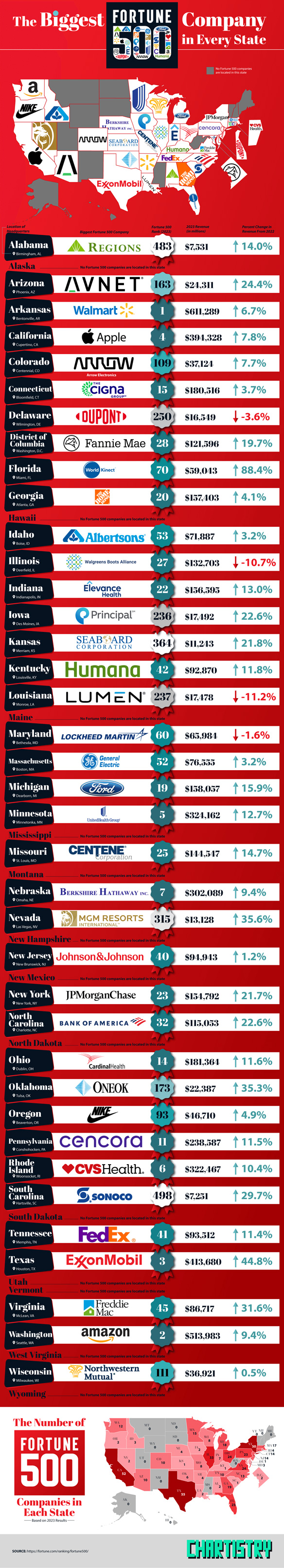 When it comes to Fortune 500 companies, we are all familiar with Apple, Walmart, and other usual suspects. Many of them are in states like California but you can find them in almost every state. This infographic from Chartistry covers the biggest Fortune 500 companies in every state: