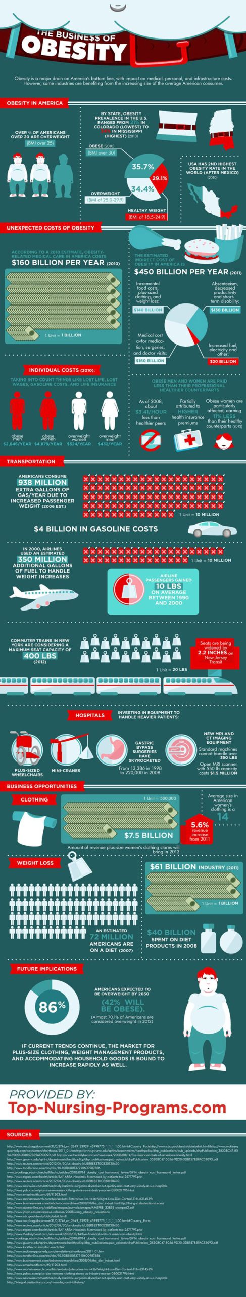 Obesity is a major drain on America’s healthcare. It can have major impact on all aspects of life. Over 2/3 of Americans over 20 are already overweight. Lack of a good diet or regular exercise can contribute to that. This infographic from Top Nursing Programs some interesting stats on obesity: