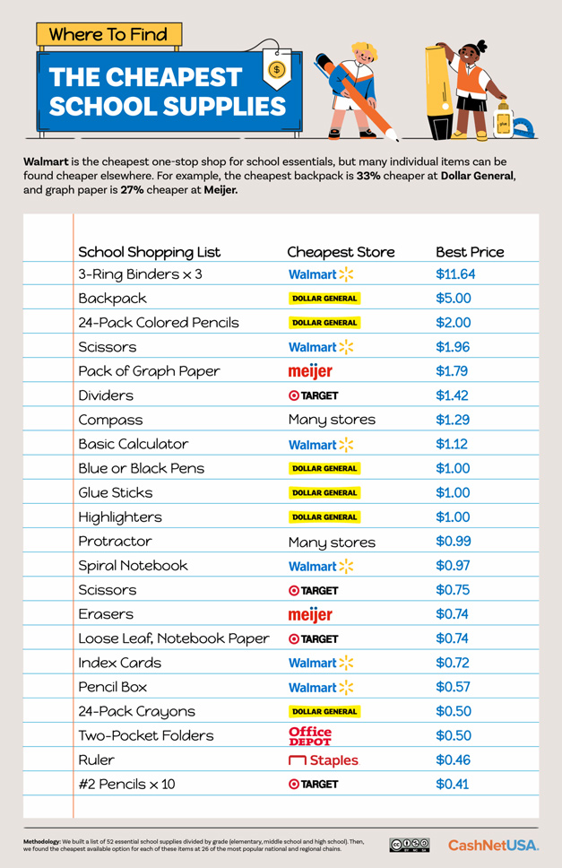 Going back to school comes with its own unique challenges for parents. They need to make sure their kids are ready for school and have everything they need to succeed. This infographic from CashNetUSA covers where parents can find the cheapest school supplies:
