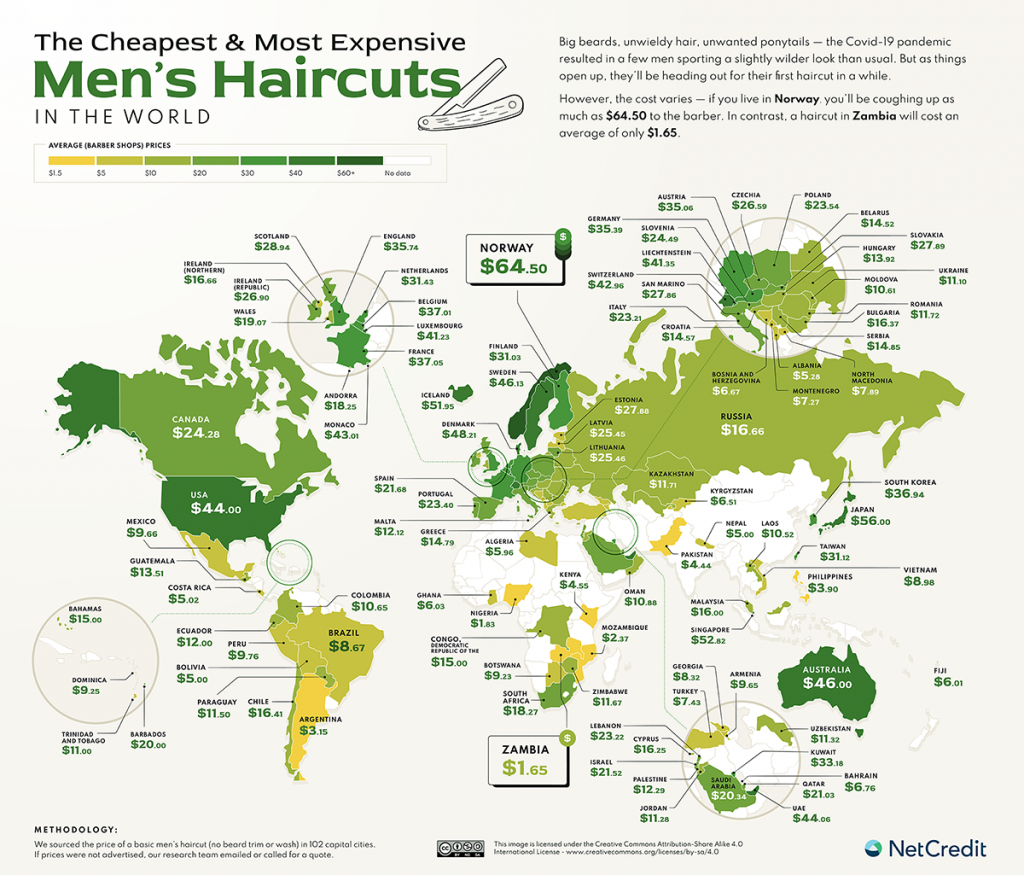 We all have to get a haircut every few months. Most of us are satisfied with a regular haircut but fancier ones do cost more. This infographic from NetCredit covers the cheapest and most expensive men’s haircuts around the world: