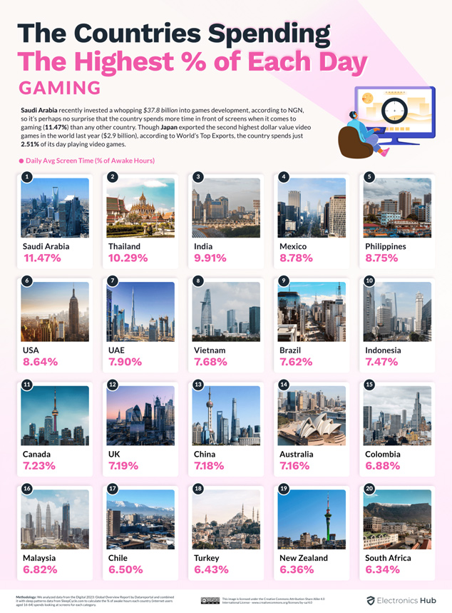 It is no secret that millions of kids and adults spend a lot of time gaming these days. Did you know that Saudi Arabia gamers spend the highest % of each day gaming? This infographic from ElectronicsHub list a few other game obsessed countries: