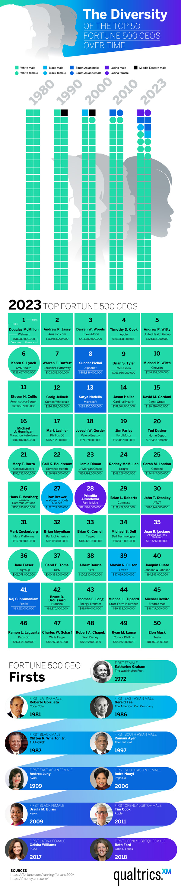 There is no doubt that the business world has become more diverse over the years but there is still a lot more that needs to be done. This infographic from Qualtrics covers the diversity of the top 50 fortune 500 CEOs over time: