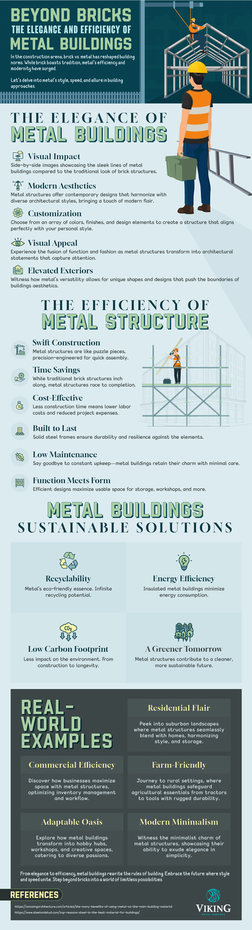Metal buildings have various advantages and disadvantages in compared to wooden and other types of structures. Metal can bear more load and can be assembled faster. You can use them for a garage, livestock shelter, and even an office space. This infographic from Viking Metal Garages covers the efficiency of metal buildings: