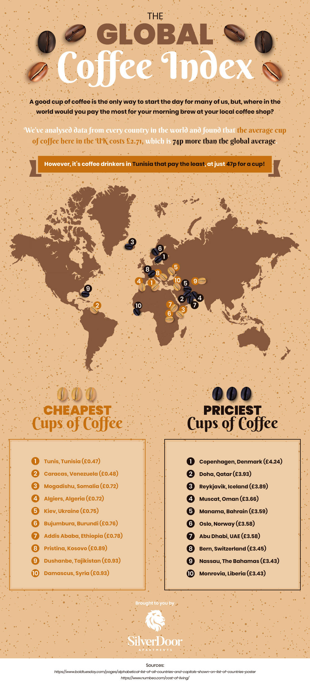 Many of us enjoy starting our day with a cup of coffee. Have you ever wondered where in the world the average cup of coffee costs the most? This infographic from Silver Door can give you a better idea: